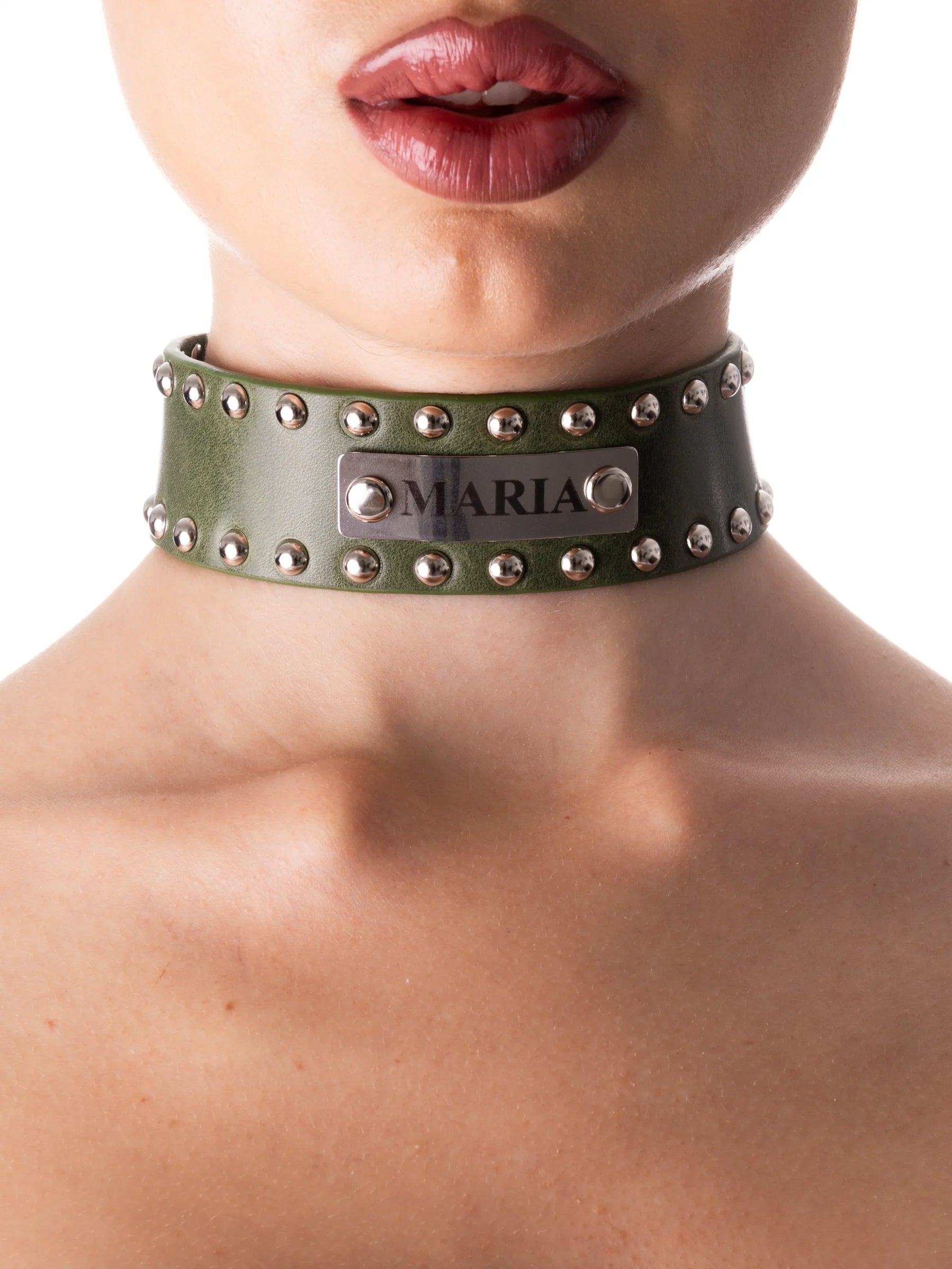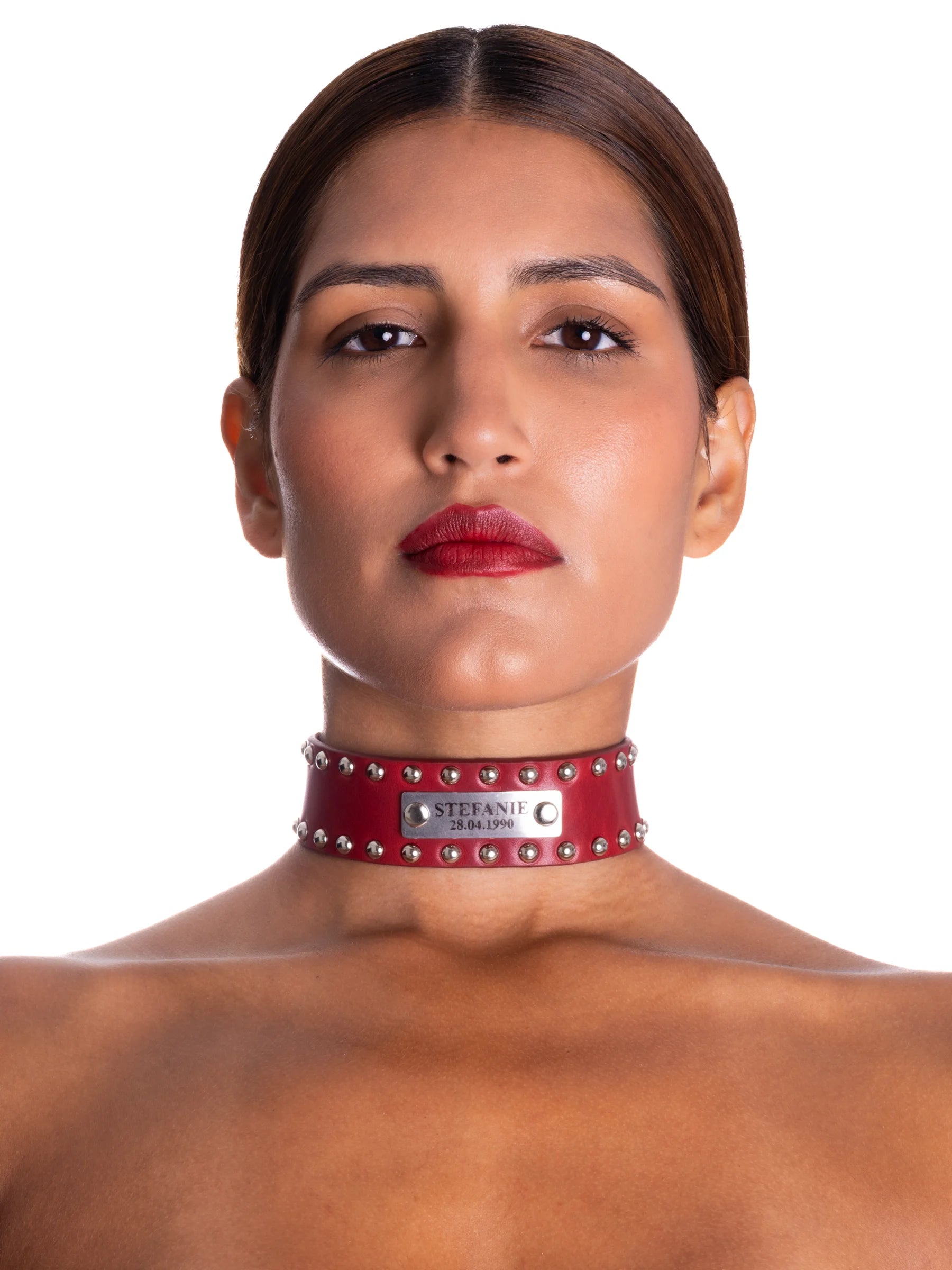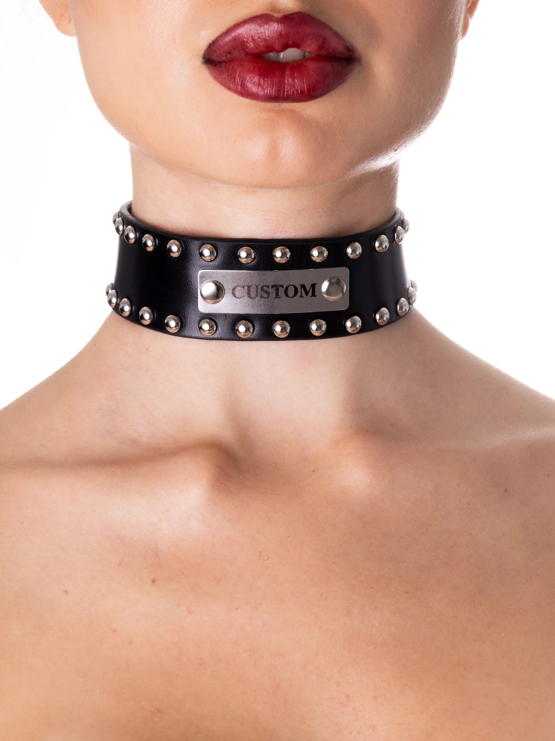 Por un lado, están los collares sumisos personalizados, que suelen incluir el nombre del sumiso. Las letras pueden estar grabadas en el cuero, adheridas como letras en relieve o mediante una placa metálica con el nombre escrito.